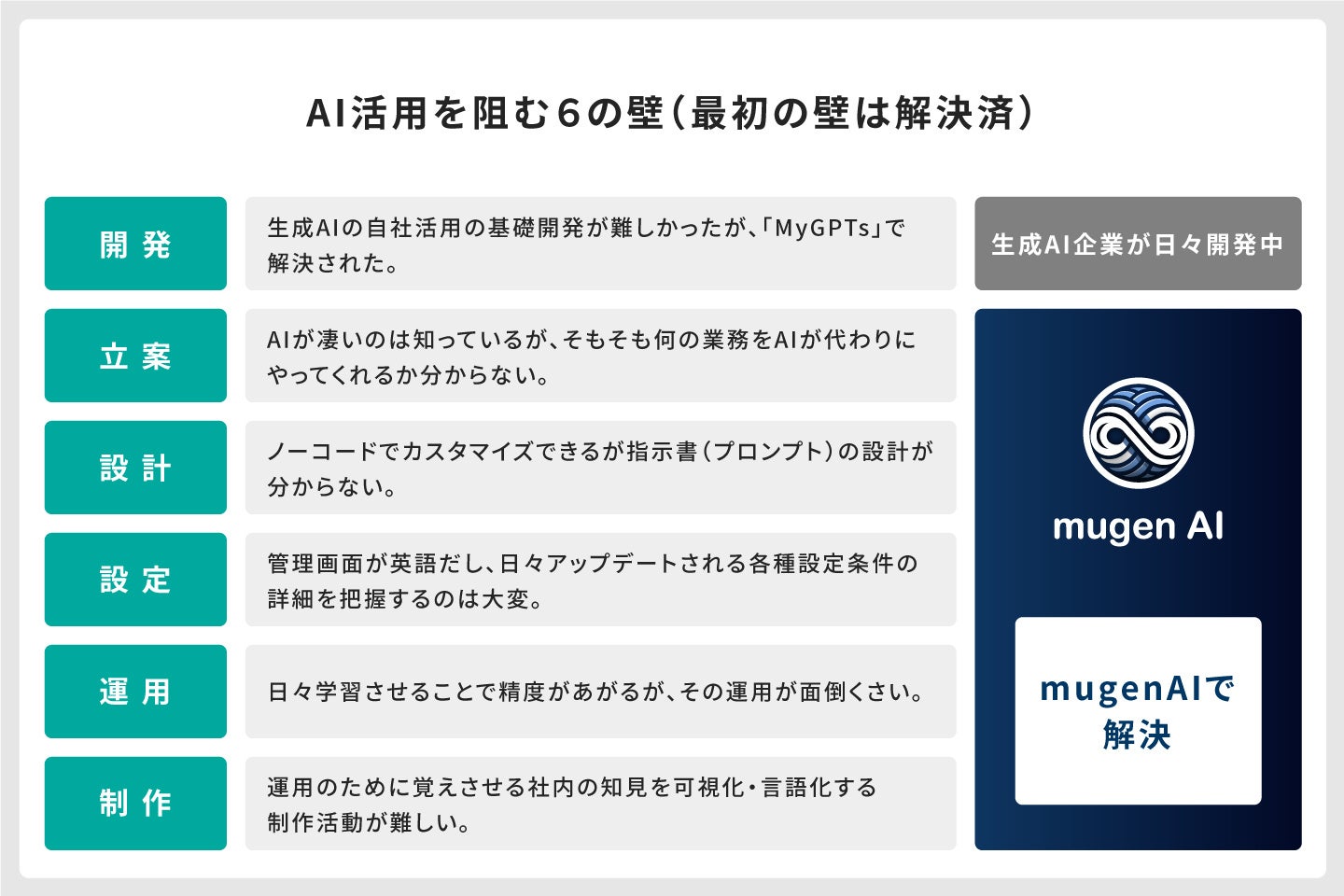 月数千円(ChatGPT有料プラン)のみで、かつノーコードで自社にカスタマイズした生成AIを導入できるにも関わらず、足踏みを踏む企業が多いのは、初期設定(活用テーマ選定とプロンプト設計)のハードルが高いからだと考えます。