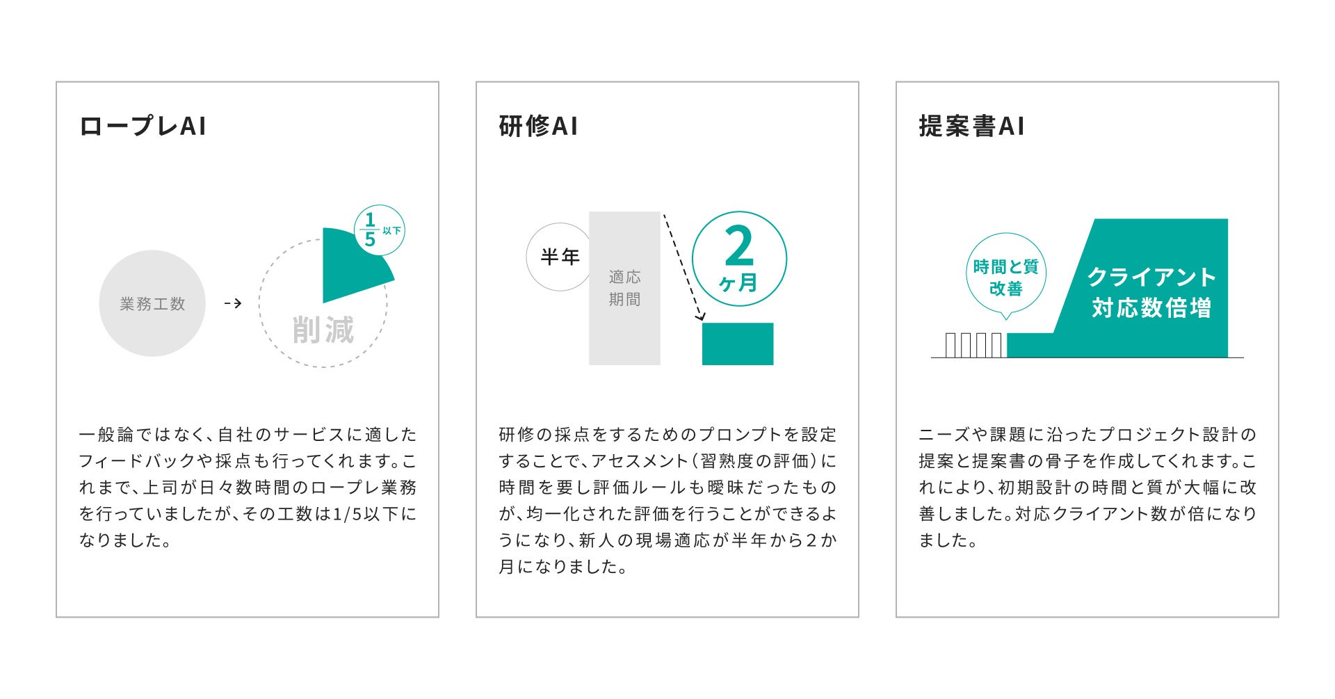 トップ営業パーソンが使用した提案資料を複数学習させ、ロープレ用のプロンプトを設定するだけで、営業ロープレを行ってくれるAIが構築されます。一般論ではなく、自社のサービスに適したフィードバックや採点も行ってくれます。これまで、上司が日々数時間のロープレ業務を行っていましたが、その工数は1/5以下になりました。
