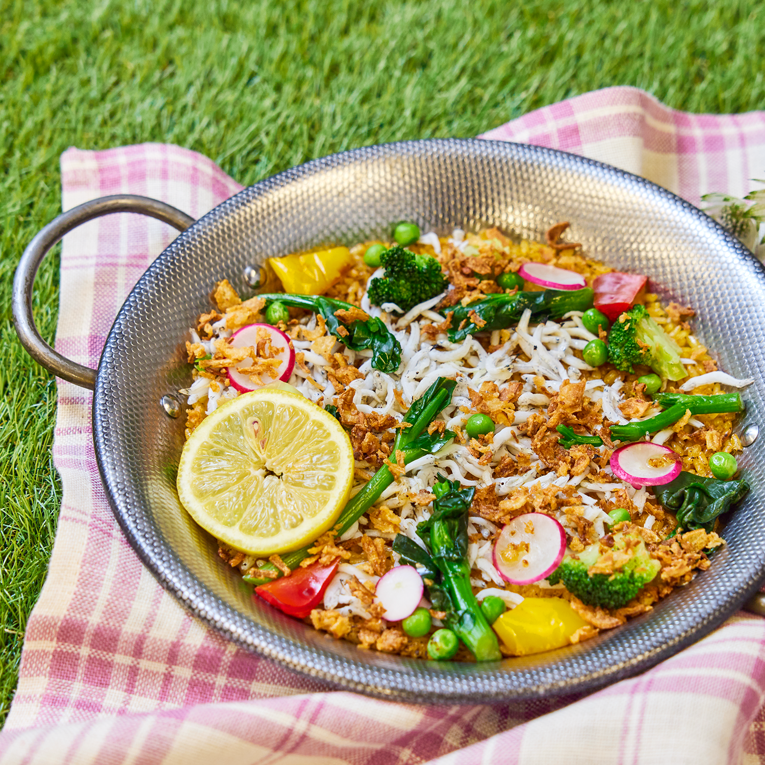 オマール海老の出汁が効いたお米に、しらすと春野菜を彩りよく添えたパエリア。テイクアウトは紙製の容器でご提供します。