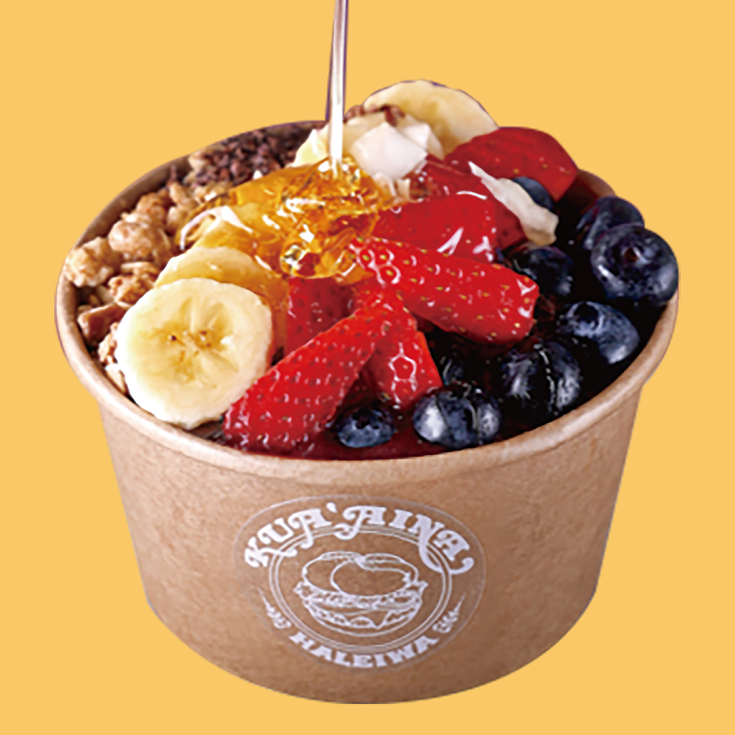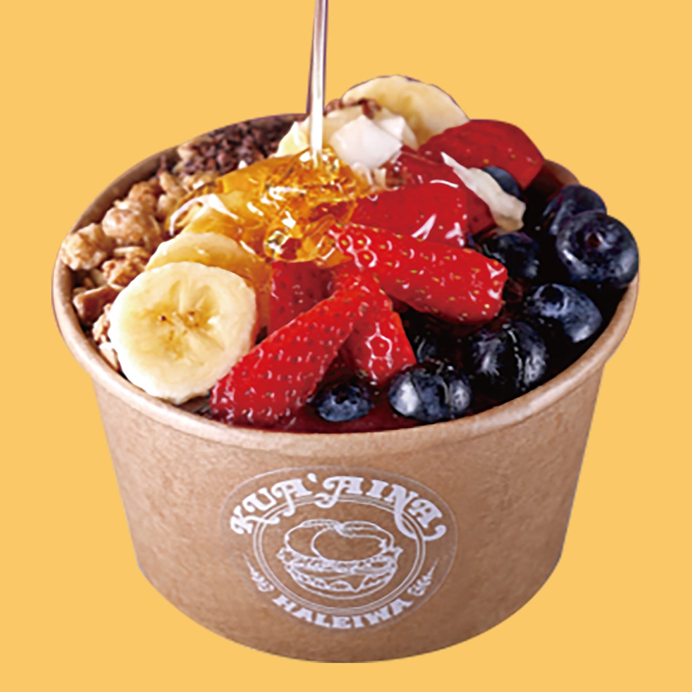 フレッシュなフルーツに、ココナッツチップとカカオニブ、食べ応えのあるグラノーラが入った栄養満点のアサイーボウルです。