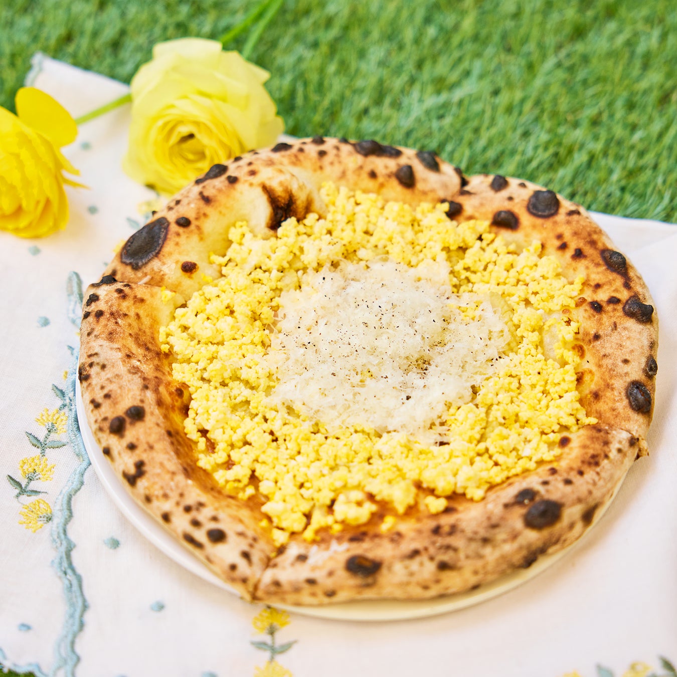 ヤングコーンとパンチェッタ、モッツァレラのピッツァ。卵で花びらを、削ったチーズでタンポポの綿毛を表現しました。