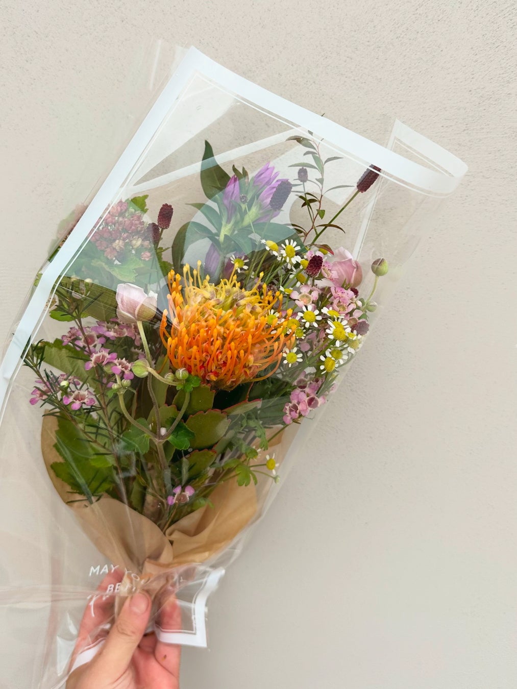 お花を選んだ後、ひとつにまとめてアレンジし、 持ち歩いても気分が上がるような可愛らしいパッケージでお渡しします。