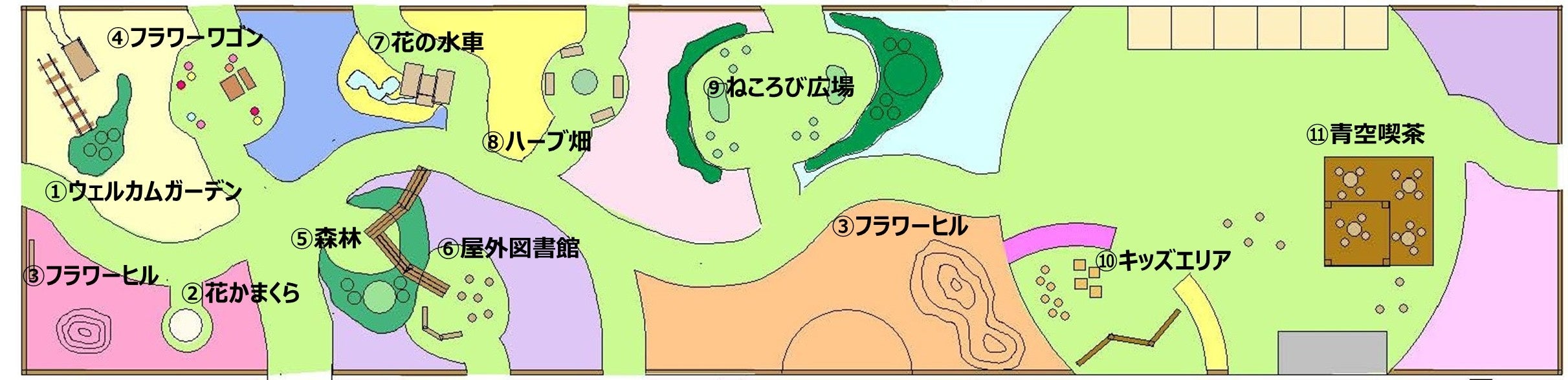 ⑤ 森林:花畑の中に高木で囲われた森林エリア。思わず深呼吸したくなるような、ゆっくりくつろげる空間。