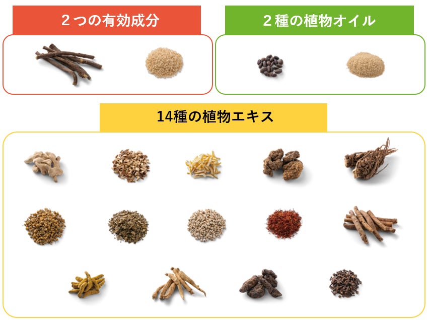 保湿成分として、2種の植物オイル(ホホバ油、コメヌカ油)と14種の植物エキス(ショウキョウ、チンピ、ユズ、トウキ、センキュウ、カモミラ、モモ葉、ヨクイニン、べニバナ、シャクヤク、ウコン、ニンジン、ジオウ、チョウジ)を配合しました。