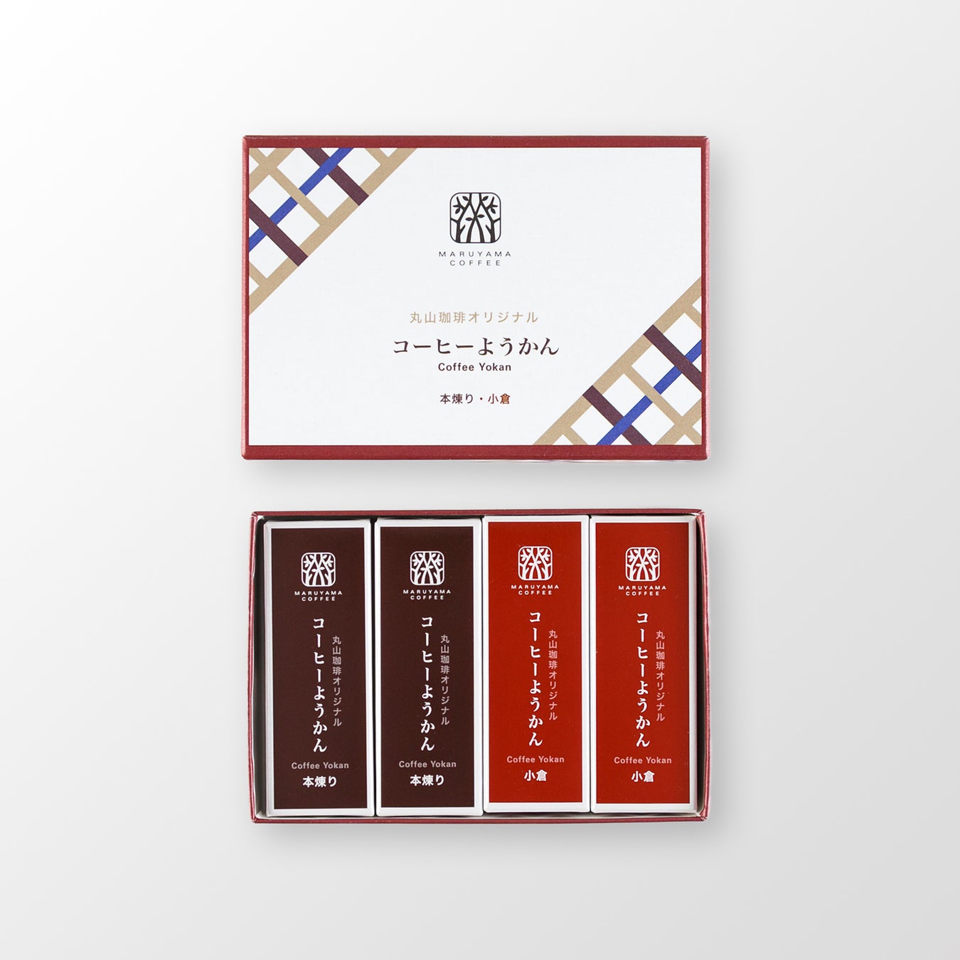 味わいは2種類、本煉りようかんと小倉ようかんをご用意しました。食べきりサイズで、切らずにそのまま手軽に食べられるので、おやつや一息付きたい時にお楽しみください。2種類のコーヒーようかんを各2点詰め合わせたセットもご用意。贈り物にも最適です。