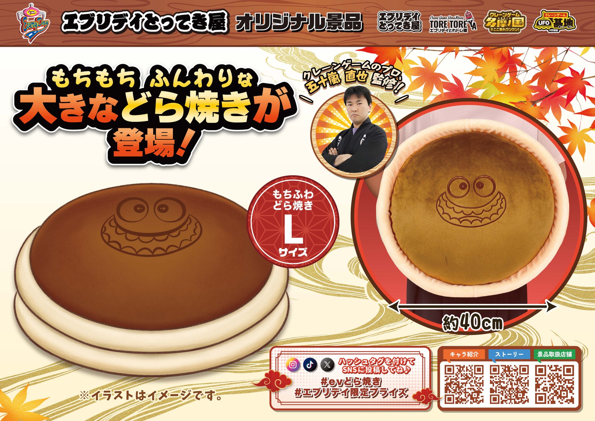 もちもち&ふんわり食感を再現した、特大サイズのどら焼きをモチーフにしたぬいぐるみが新登場となります! 直径約40cmのビッグサイズで、思わず抱きしめたくなるインパクトとボリューム感が魅力です。表面には、エブリデイとれトレ屋 桶川店のキャラクター「トレ」の顔が焼き印風に刺繍された特別なデザインを採用。