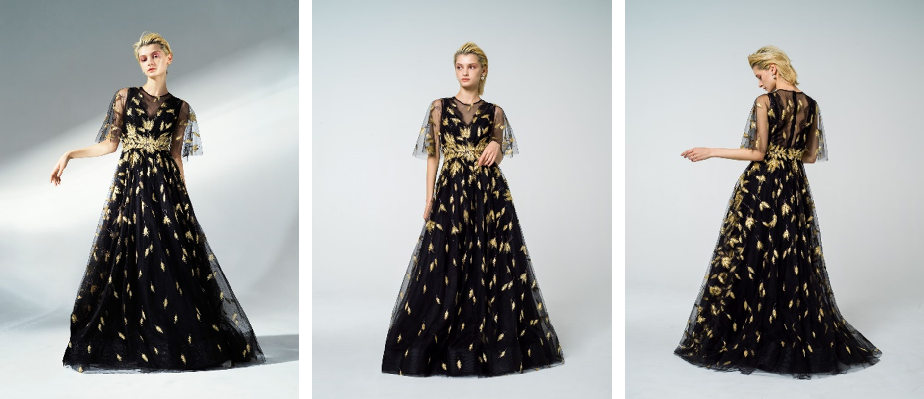 動くたびにゴールドの刺繍がきらめき、忘れられないインパクトと個性を表現。
