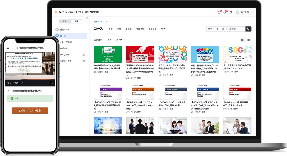 「AirCourse」( https://aircourse.com )は、企業向け社員教育eラーニングサービスです。社員教育でニーズの高い動画eラーニングコース675コース4,105本が受け放題(2月28日現在)となっているほか、簡単に自社の研修動画、マニュアル動画などを共有・配信できます。