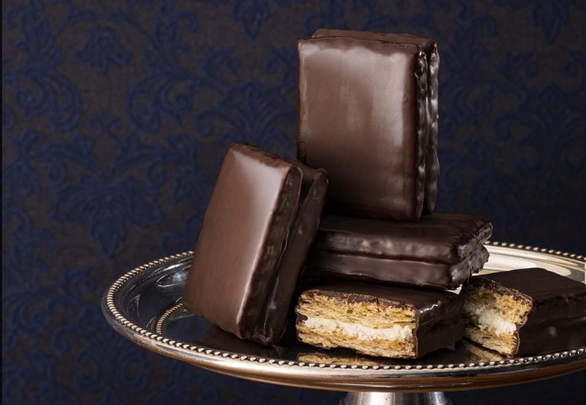 コクと香りを追い求めた炭火ショコラを際立たせるため、じっくりこんがり焼きあげた生地の間にはこだわりのミルククリームをサンドしました。さくっとかむと一気に広がる、炭火ショコラのキレのある濃厚な味わいをお楽しみください。