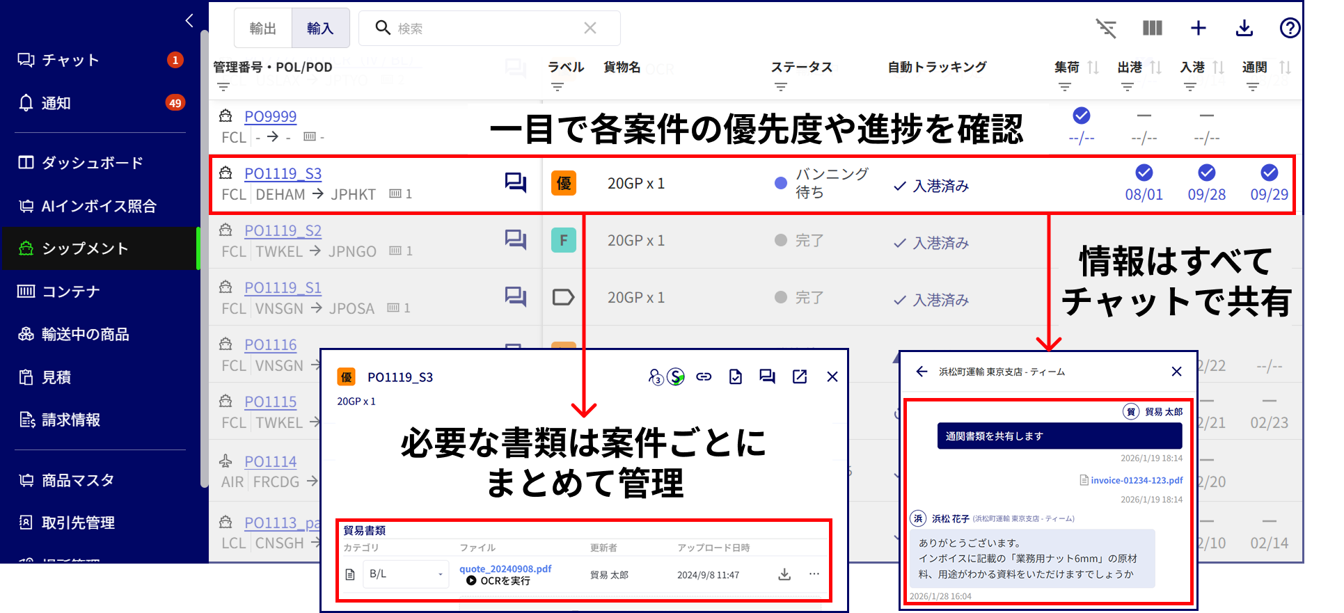 案件単位ですべての書類や進捗をShippio Platformへ集約し、社内メンバー・社外へのゲストアカウント発行により情報共有・連絡・管理をShippio Platformに一元化。社内外を巻き込んだ能動的な連携体制を構築。 -