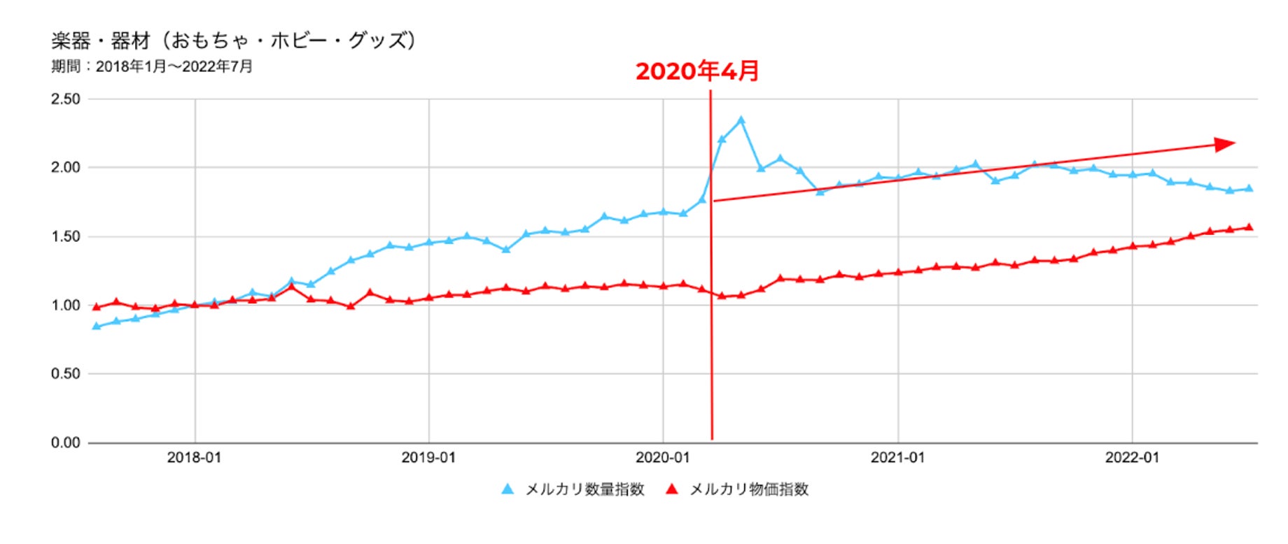 2020年の山野楽器のプレスリリース(※2)によると、おうち時間の増加により「楽器」の需要が増加しているとされています。「メルカリ」でも、楽器の演奏をはじめたり、練習を再開したりと音楽にチャレンジする方や親しむ方のニーズの増加で「メルカリ」上でも楽器の取引は前年比約1.5倍(※3)と増加しました。それに合わせるように物価指数も上昇基調に変化しており、おうち時間の充実需要は現在でも継続的に存在していることが示唆されます。