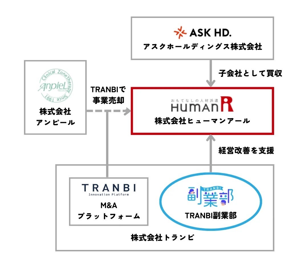 対象となる企業は、人材派遣事業を行う株式会社ヒューマンアール(東京都港区)。製造業を本業とするアスクホールディングス株式会社(長野県長野市)が新事業展開のため人材派遣事業を買収し、子会社として新設しました。この度、2023年5月に開催した副業者とのリアルマッチアップイベントにてヒューマンアール社とマッチングしたTRANBI副業部に在籍する副業人材数名を採用し、同社従業員とともに1年後の売上1.5倍を目標に、PMIの成功を目指します。