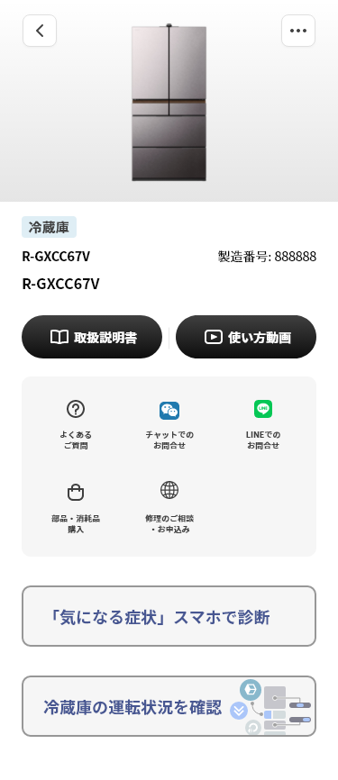 (*2) 「気になる症状」をスマホで手軽に診断する新機能の対応機種は、コネクテッド家電の冷蔵庫(R-KC11R、R-KX57Kを除く)、洗濯機(BD-NX120Cを除く)となります。