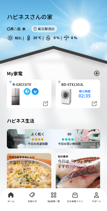 「ハピネスアップ」は、お客さまに便利を超えた豊かさを提供すべく、家事に関わるさまざまなヒントを提供し、日々の快適な暮らしをサポートすることをめざしています。日立の家電品をお持ちのすべてのお客さま(*3)向けに提供しているアプリです。
