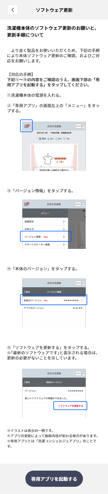 お使いのコネクテッド家電の本体ソフトウェア更新が未対応のお客さまに、アプリのホーム画面で更新のお 知らせをします。製品ごとに提供しているコネクテッド家電の専用アプリを起動し、お知らせに記載の更新手 順に従って操作することで、お客さま自身でバージョンアップいただけます(*5)。