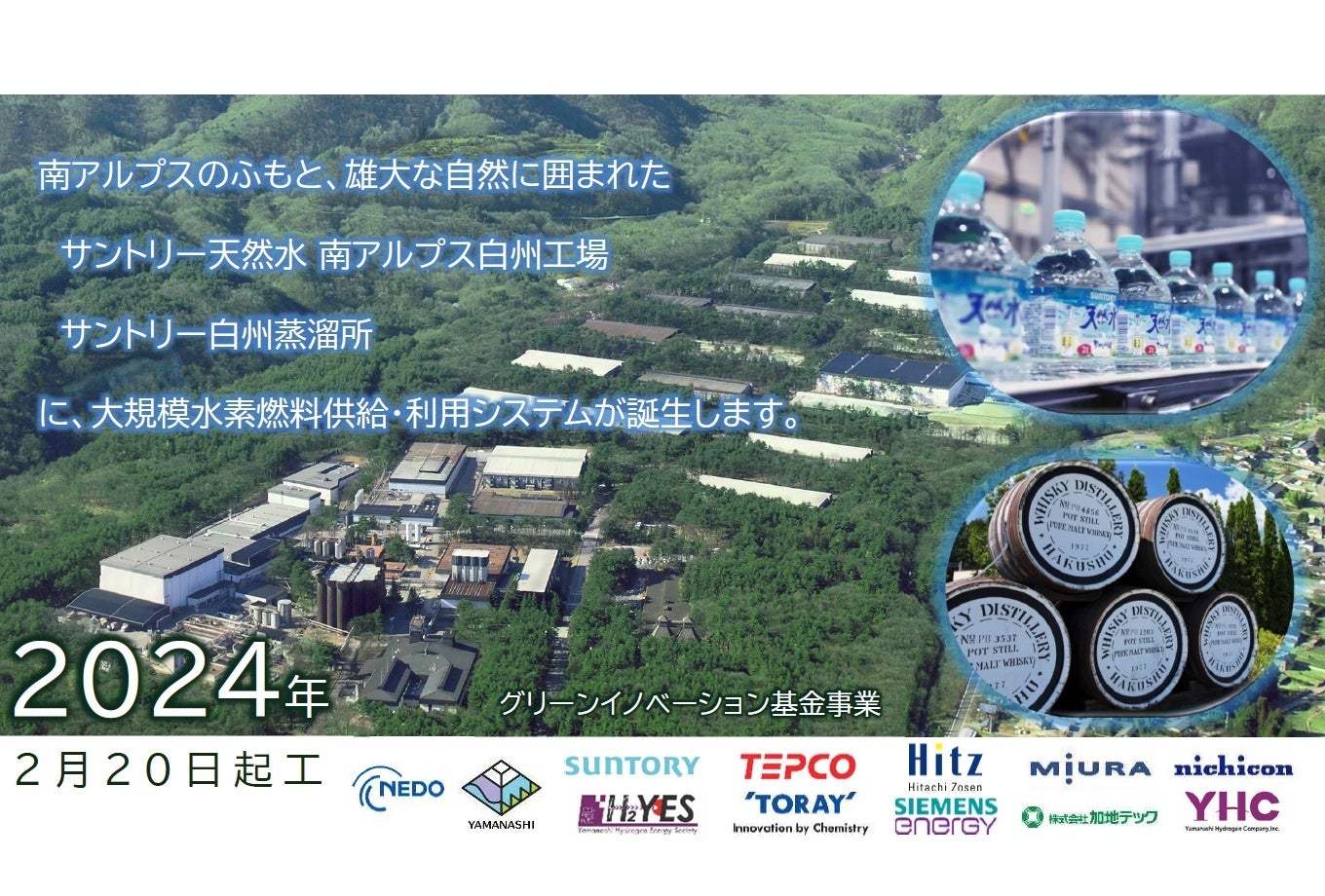 山梨県(県庁:山梨県甲府市、知事:長崎幸太郎(ながさきこうたろう))並びに技術開発参画企業10社※1は、大規模P2Gシステム※2によるエネルギー需要転換・利用技術開発に係る実証事業地であるサントリー天然水 南アルプス白州工場及びサントリー白州蒸溜所(山梨県北杜市)の脱炭素化を目指して、大規模P2Gシステムの構成機器をトータルシステムとして構築する現地工事を本日開始しました。