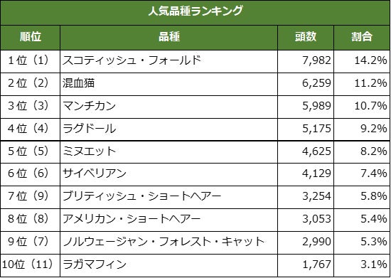 「スコティッシュ・フォールド(7,982頭)」が17年連続で1位を獲得しました。2位「混血猫(6,259頭)」、3位「マンチカン(5,989頭)」と続き、6位までの順位に変動はありませんでした。