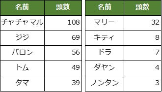 「トム(49頭)」「タマ(39頭)」など、おなじみの名前も上位に並んでいます。