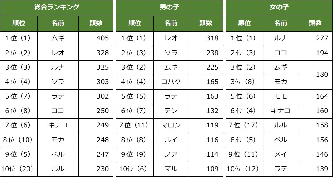 女の子部門では、昨年トップの「ルナ」が3連覇を達成。2位は昨年3位の「ココ」が入りました。7位は昨年17位から大きくランクアップした「ルル」、9位には昨年11位の「メイ」、10位には昨年12位の「ラテ」がそれぞれランクアップしています。