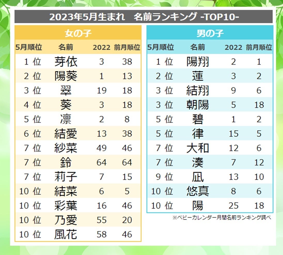 5月生まれの女の子に人気の名前、3年連続1位は「MAY(芽依)」! 女の子は涼しげな名前、男の子は「と止めネーム」が人気!2023年『5月生まれベビーの名づけトレンド』発表!