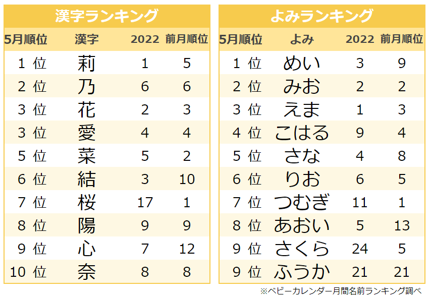 そして、5月には他にも人気が集中した名前がありました。例えば、「翠(主なよみ:すい)」は4月の18位から5月には3位に増加。「鈴(主なよみ:すず)」は4月の64位から5月には7位にランクアップ。「風花(主なよみ:ふうか)」も4月の46位から5月には10位に大きく上昇しています。