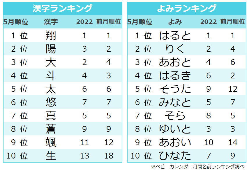 特筆すべきは、4月6位から5月には3位に上昇した「あおと」と、4月の14位から5月には9位にランクアップした「あおい」。「あお」というよみは明るく開放的でおおらかな印象を受ける響きです。女の子のよみランキングでも8位に「あおい」、79位に「あお」がランクインしています。このようによみに「あお」を用いた名前は、男女どちらにも多く名づけられており、近年人気の「ジェンダーレスネーム」の一つでもあります。