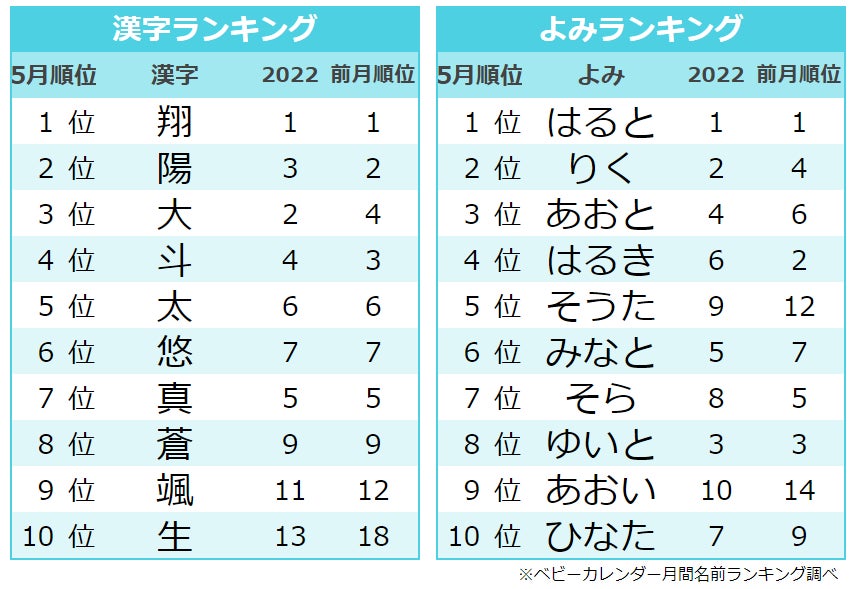 2022年 赤ちゃんの名前ランキング、名前のよみランキング、