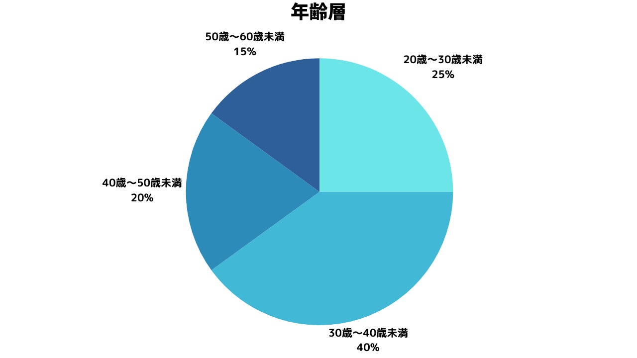回答者の年齢層は30歳〜40歳が最も多く40.0%、次に20歳〜30歳が多く25.0%という結果になりました。
