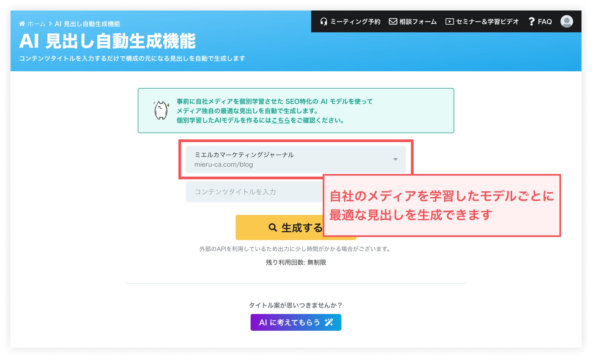 一般的なSEO特化の見出し自動生成機能やコンテンツ制作アシスタントツールは、キーワードを入力するだけで見出しを生成するため時短にはなりますが、本機能では各社メディアの特性を深く反映させた見出し生成が可能です。