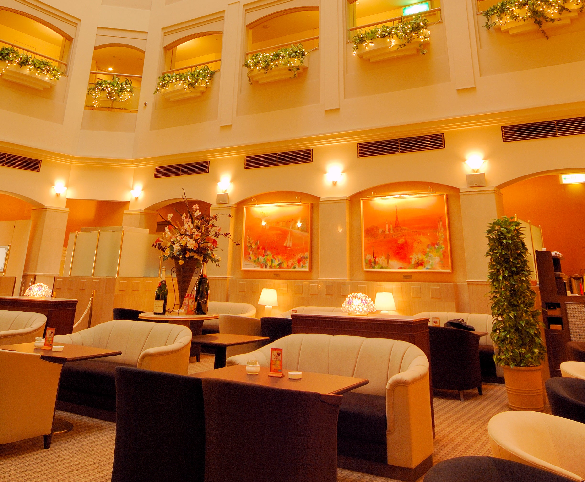 ホテル32階レストランラウンジ「プラシャンティ」。吹き抜けが開放的なアトリウムで心躍る特別なひとときをお過ごしください。