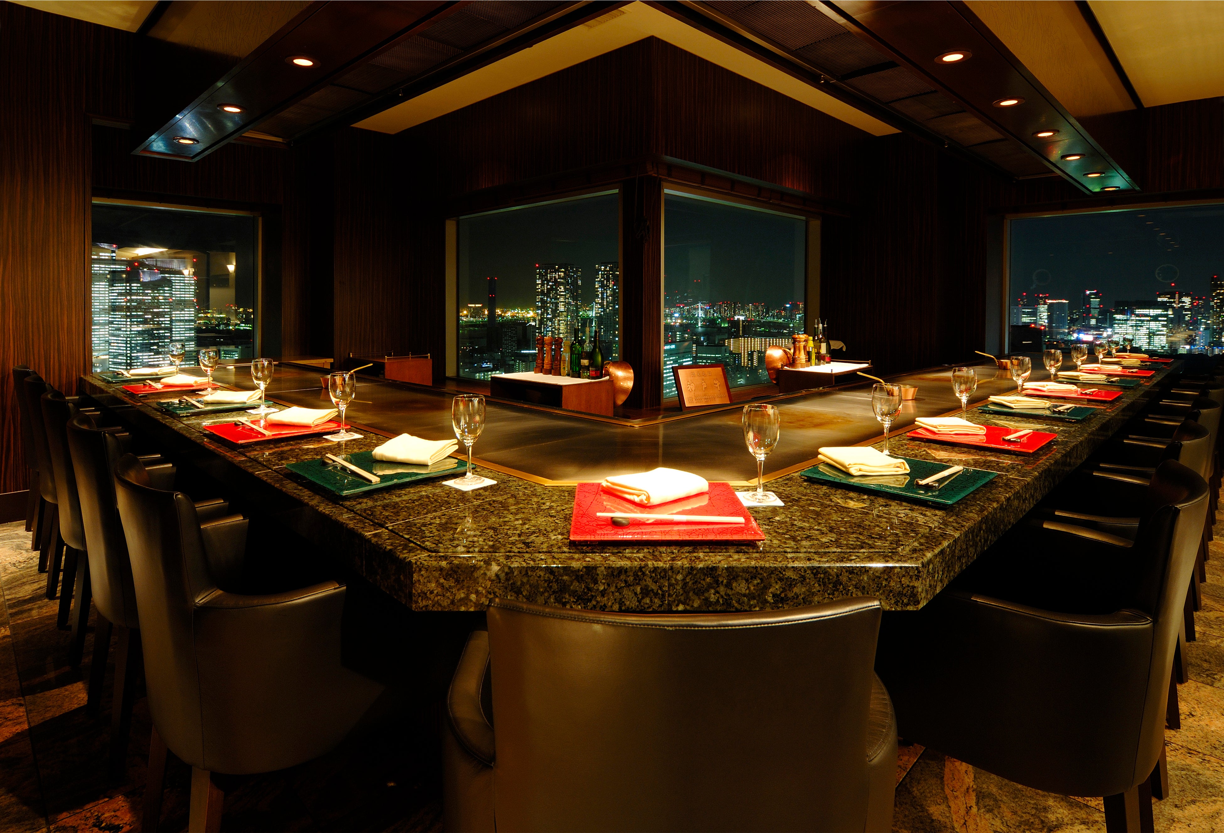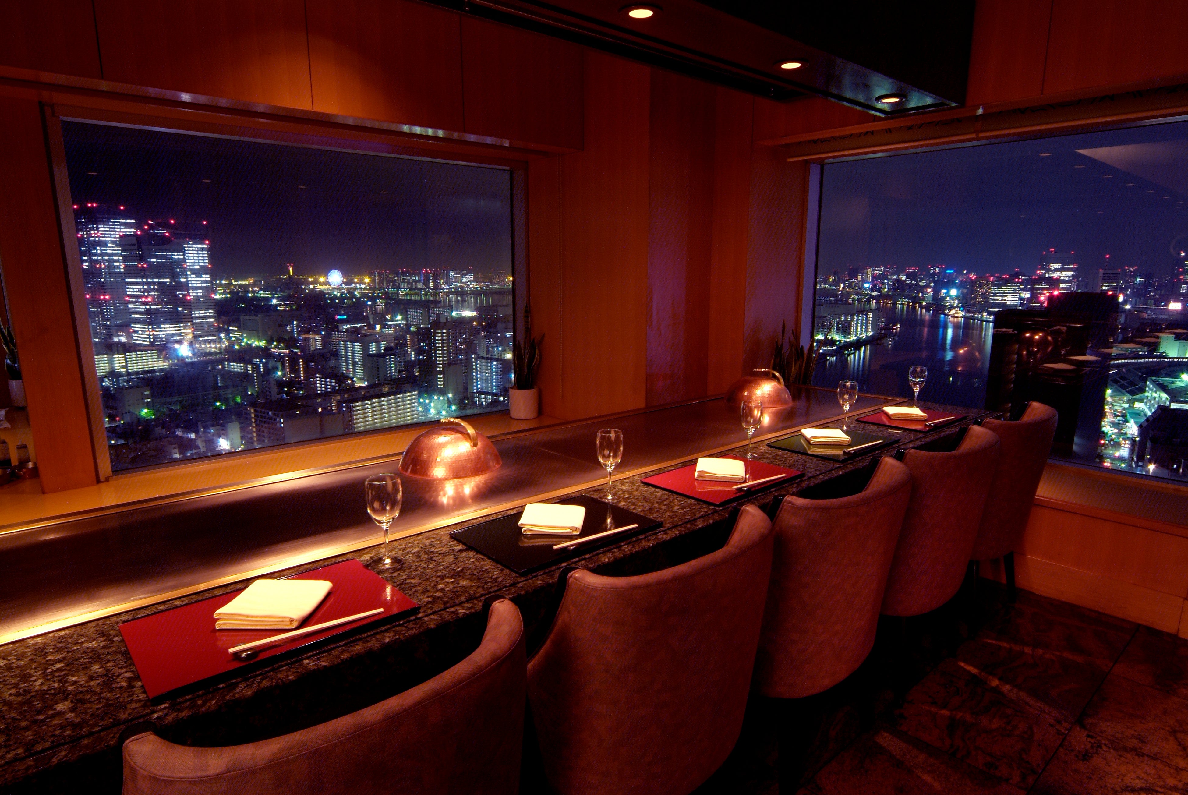 ホテル32階鉄板焼レストラン「華山」。夜の光の海が一面に広がる鉄板焼カウンター。