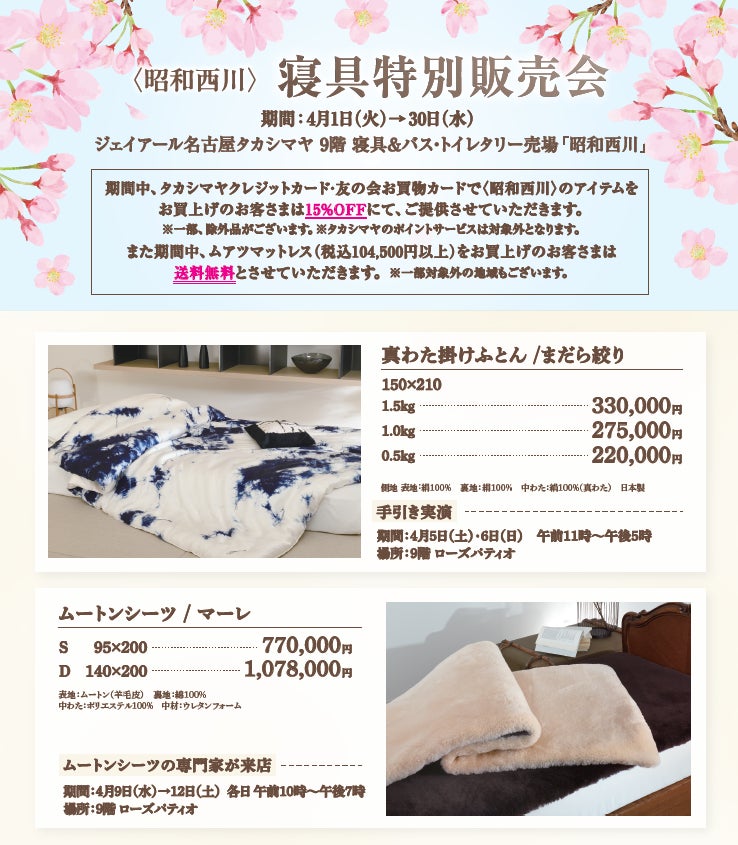 4/2(水)〜4/15(火)【昭和西川】ジェイアール名古屋タカシマヤ9階ローズパティオにてこだわり寝具展開<真わた&ムートン実演販売会も>