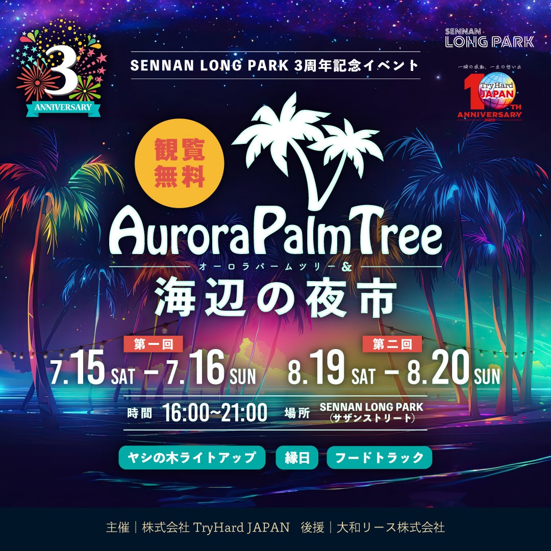 SENNAN LONG PARK開園3周年を祝して、同公園のシンボルであるヤシの木を一部ライトアップし、夜のビーチを色鮮やかに彩ります。同時開催されるフードトラックイベント「海辺の夜市」では、ボリューム満点の肉料理やスイーツを堪能できる他、お子様に大人気の縁日やDJによるパフォーマンスでお祭り気分を味わえます。
