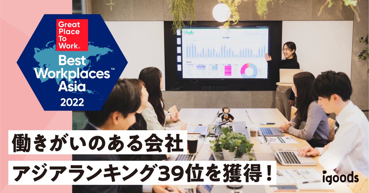 オリジナルグッズを製作するアイグッズ株式会社(本社:東京都渋谷区)は、Great Place to Work ® Institute(以下、GPTW)が選出する2022年度版アジア地域における「働きがいのある会社」ランキングにて中小企業部門(従業員数10~499名)39位を受賞しました。