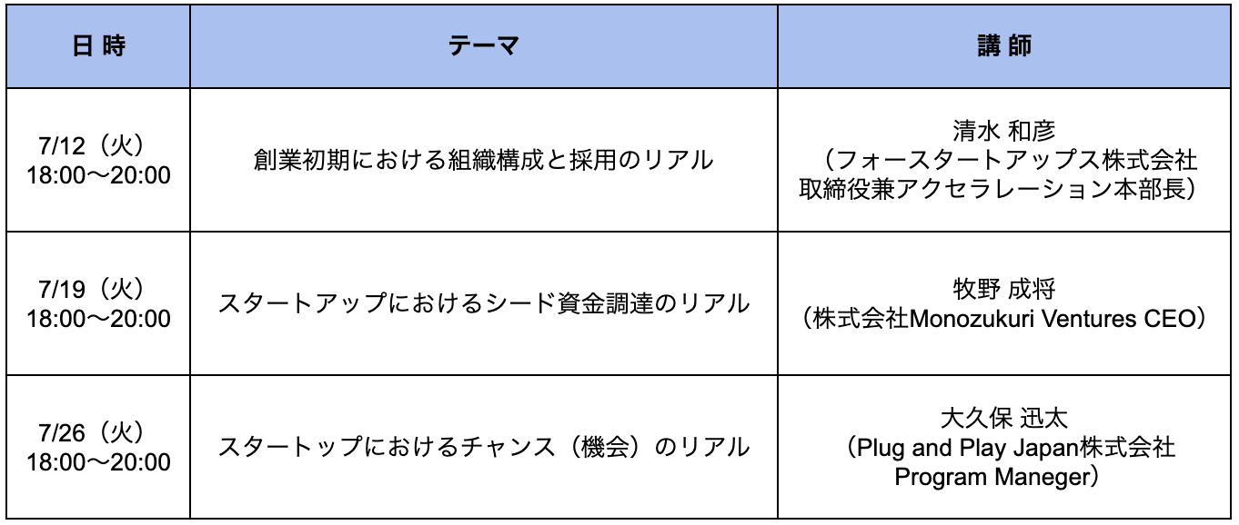 先輩起業家やVCから事業化初期における3つのハードル(ヒト・カネ・チャンス)について実体験に基づく話を聞き、自事業への投影を促進してリアリティの向上を図る。