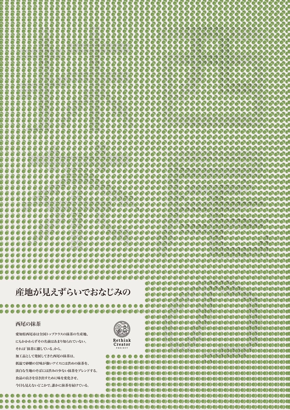 Rethink Creator賞(最優秀賞)に輝いたのは、小笠原 葉南さん作 「産地が見えづらいでおなじみの」。「西尾の抹茶」の認知度に着目し、その見えづらさをデザインで見事に表現している点が高い評価を得ました。