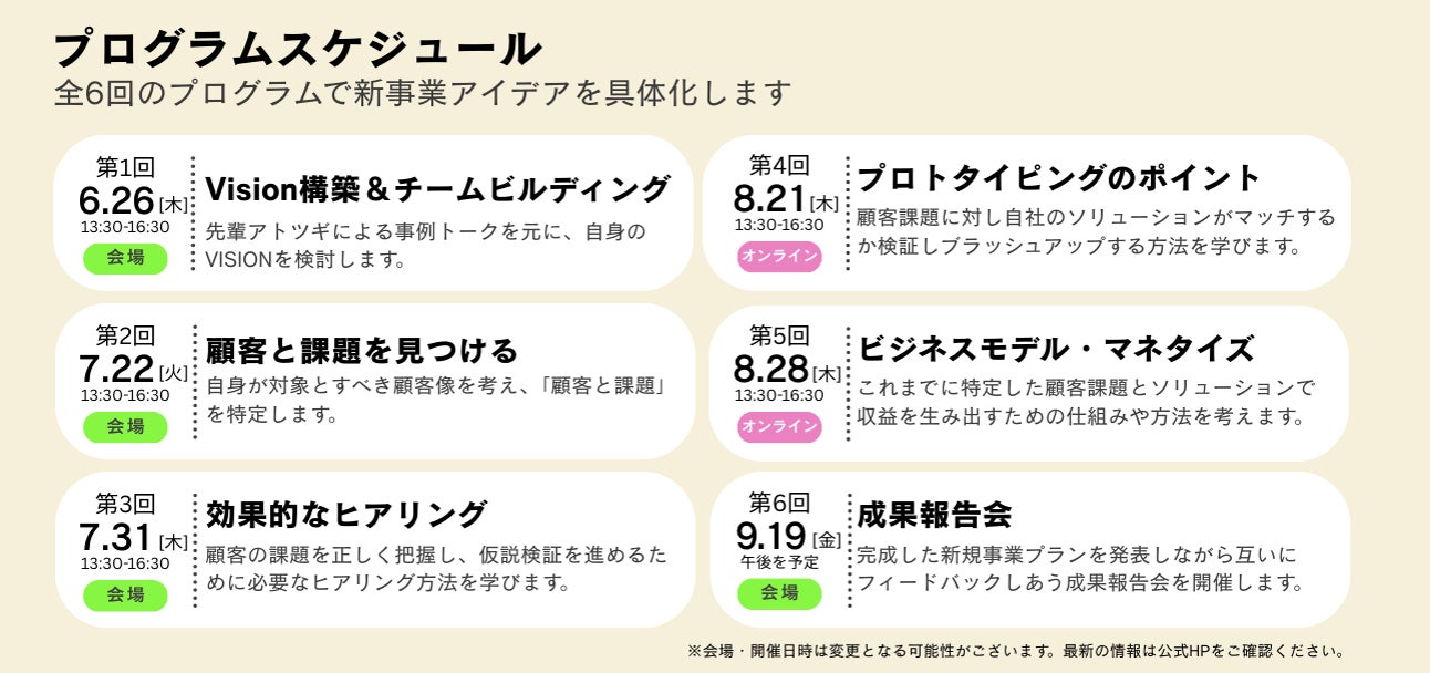 アイデアで終わらせないために、プログラム期間中は顧客へのヒアリングを必須とし、アイデアを現実に近づける“実践重視”の内容となっています。