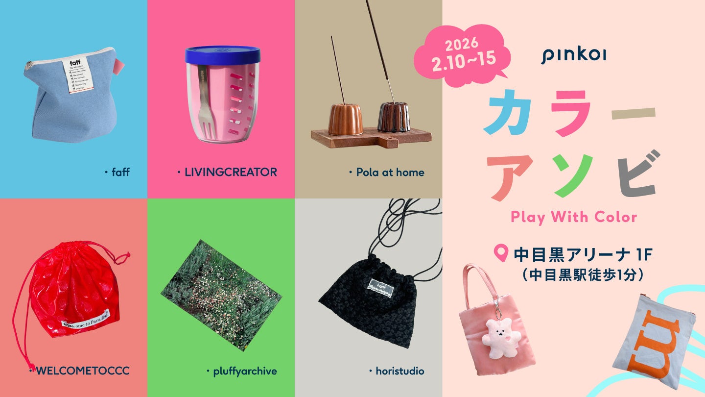 台湾発・アジア最大級の越境ECサイト Pinkoi(ピンコイ) は、韓国の人気カラーデザイン雑貨を集めたPOPUPイベント「Play with Color カラーアソビ」 を、2026年2月10日(火)〜2月15日(日)の6日間、中目黒アリーナ1Fにて開催します。