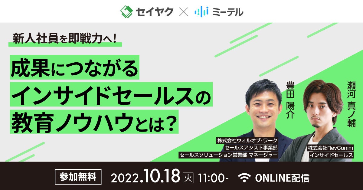 ウィルグループの総合人材サービスを手掛ける株式会社ウィルオブ・ワーク(本社:東京都新宿区、代表取締役社長:告野 崇)は、音声解析AI電話「MiiTel(ミーテル)」を手掛ける株式会社RevComm(本社:東京都渋谷区、代表取締役:會田 武史)と共催で、無料オンラインセミナー『新人社員を即戦力へ!成果につながるインサイドセールスの教育ノウハウとは?』を、2022年10月18日(火)に開催します。
