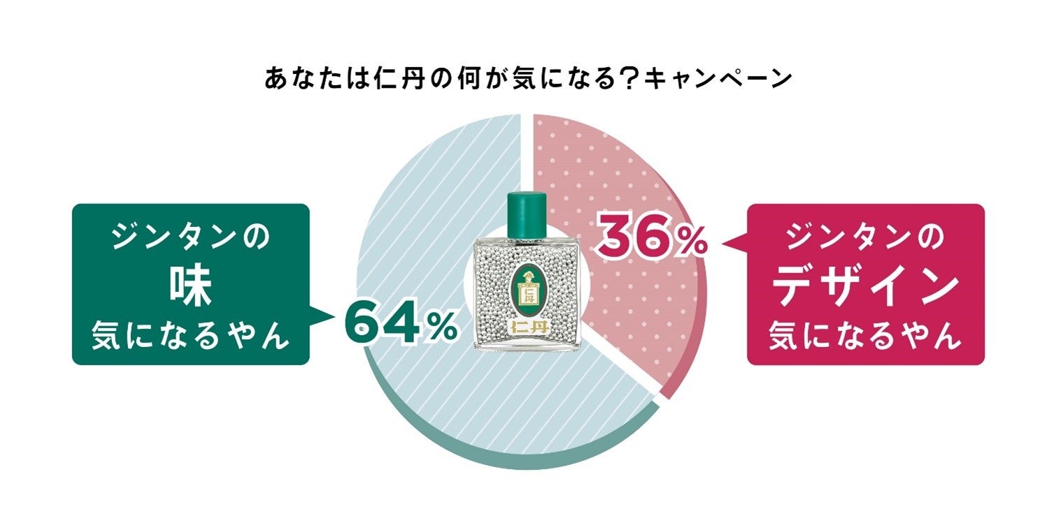 2024年2月11月(日)より、「銀粒仁丹」を食べたことがないユーザーが多い中、「銀粒仁丹」のボトルのデザインか味かどちらが気になるかを募ったキャンペーン「あなたはジンタンの何が気になる?キャンペーン※」を開催しました。計3,994名の方々にご参加いただいた結果、ジンタンの味が「気になるやん!」と思った方々が64%と、ジンタンのデザインが気になる方々と比べて、多いことが分かりました。