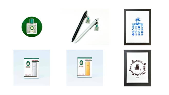 (左上:銀粒仁丹オリジナルステッカー、上中:オリジナルボールペン、右上・左下:オリジナルミニクリアファイル、下中・左下:仁丹メタルケース)