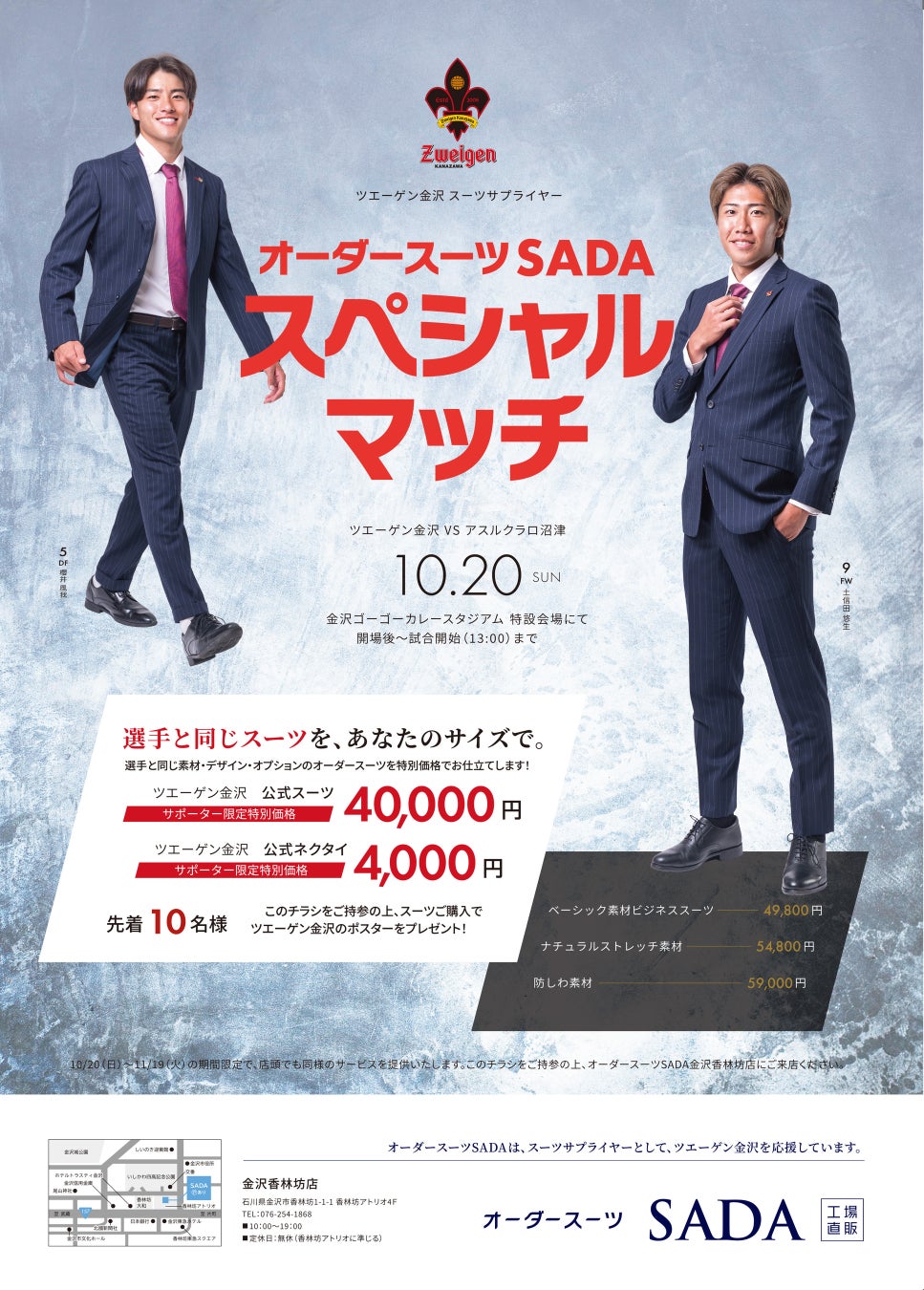 「ツエーゲン金沢」 オフィシャルスーツサプライヤー オーダースーツSADAオフィシャルスーツ スタジアム予約販売会10月20日(日)開催