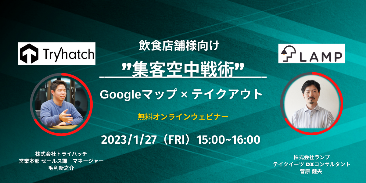 【2023年1月27日(金)15:00〜16:00】株式会社トライハッチ × 株式会社ランプ 共催「飲食店向け”空中戦術”」~Googleマップ×テイクアウト 売上促進法~