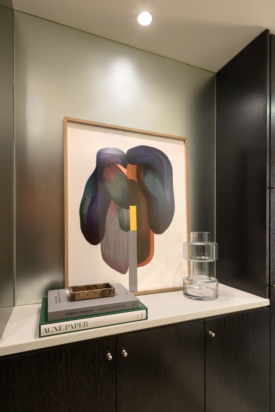 お客様を迎え入れるにふさわしい“上質さ“と日常使いのための“くつろぎ“を両立させたスタイリング。ブラウン〜グレーの落ち着いたトーンにゴールドカラーやレトロなディテールを加え、程よいメリハリを生み出しています。家具はカッシーナ社のものを中心に国内外の上質なラインナップを使用し、空間のポイントとなるビッグテーブルやキッチンカウンター、ブックシェルフはデザイン・機能ともに空間にマッチするよう特注で製作しました。