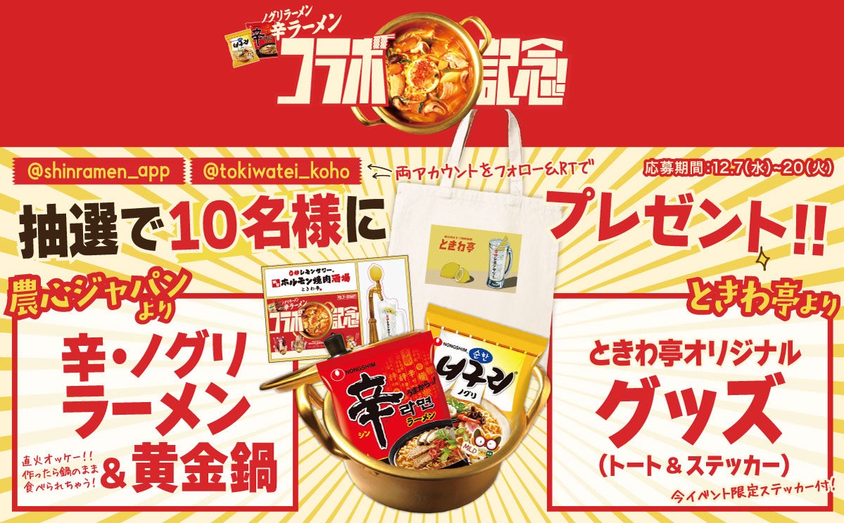この度、当店のメインターゲットでもあるZ世代を中心にブームが絶えない韓国グルメの中でも、韓国ドラマや映画などでも登場し日本でも絶大支持を誇る「辛ラーメン」とコラボレーションします。12月7日(水)よりコラボメニュー「辛・ときわ亭ラーメン」と「ノグリ・ときわ亭ラーメン」を発売。これを記念して、同日より期間限定で、『辛ラーメンコラボ記念!実は冬でも美味しい!?ふるる冷麺プレゼント』キャンペーンを開催いたします。コラボメニューをご注文いただいたアプリ会員向けに数量限定で「ふるる冷麺(水冷麺、ビビン冷麺)セット」をプレゼント。さらに、ときわ亭と辛ラーメンの公式Twitterアカウントをフォロー&リツイートしてくれた方の中から抽選で10名様に「辛・ノグリラーメン&鍋セット」と「ときわ亭オリジナルグッズ(トートバッグ&ステッカー)」をプレゼントいたします。