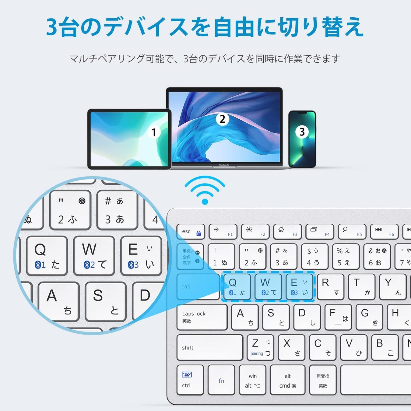 タブレットやスマホ、PCなどを最大3台までペアリング可能です。ワンタッチでデバイスを切り替えることができるマルチペアリング機能を搭載しています。PCで資料を作成しながらスマホのメールを返信するなどキーボード1台で完結することができます。
