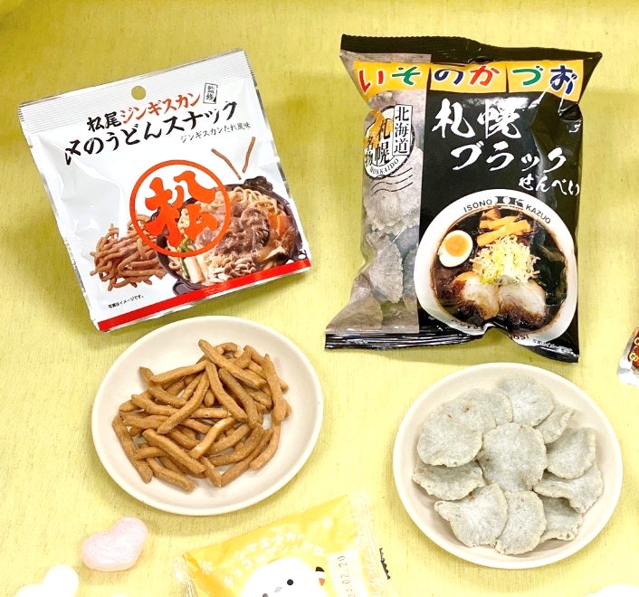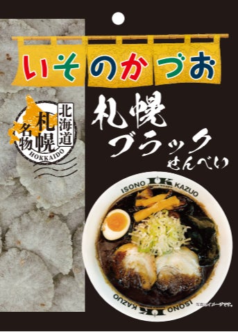 「いそのかづお 札幌ブラックせんべい」は札幌すすきので不動の人気を誇る、見た目が真っ黒なラーメン「札幌ブラック」が名物の「いそのかづお」とコラボレーション。醬油のコクが感じられるおせんべいにガーリックパウダーを練り込むことで、にんにくが効いた札幌ブラックの味を再現しました。