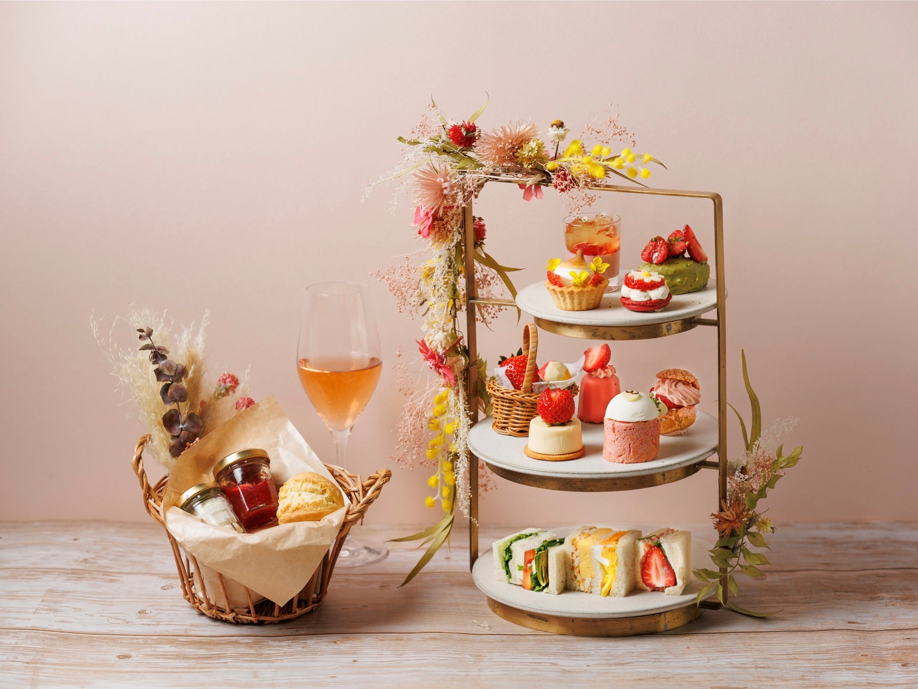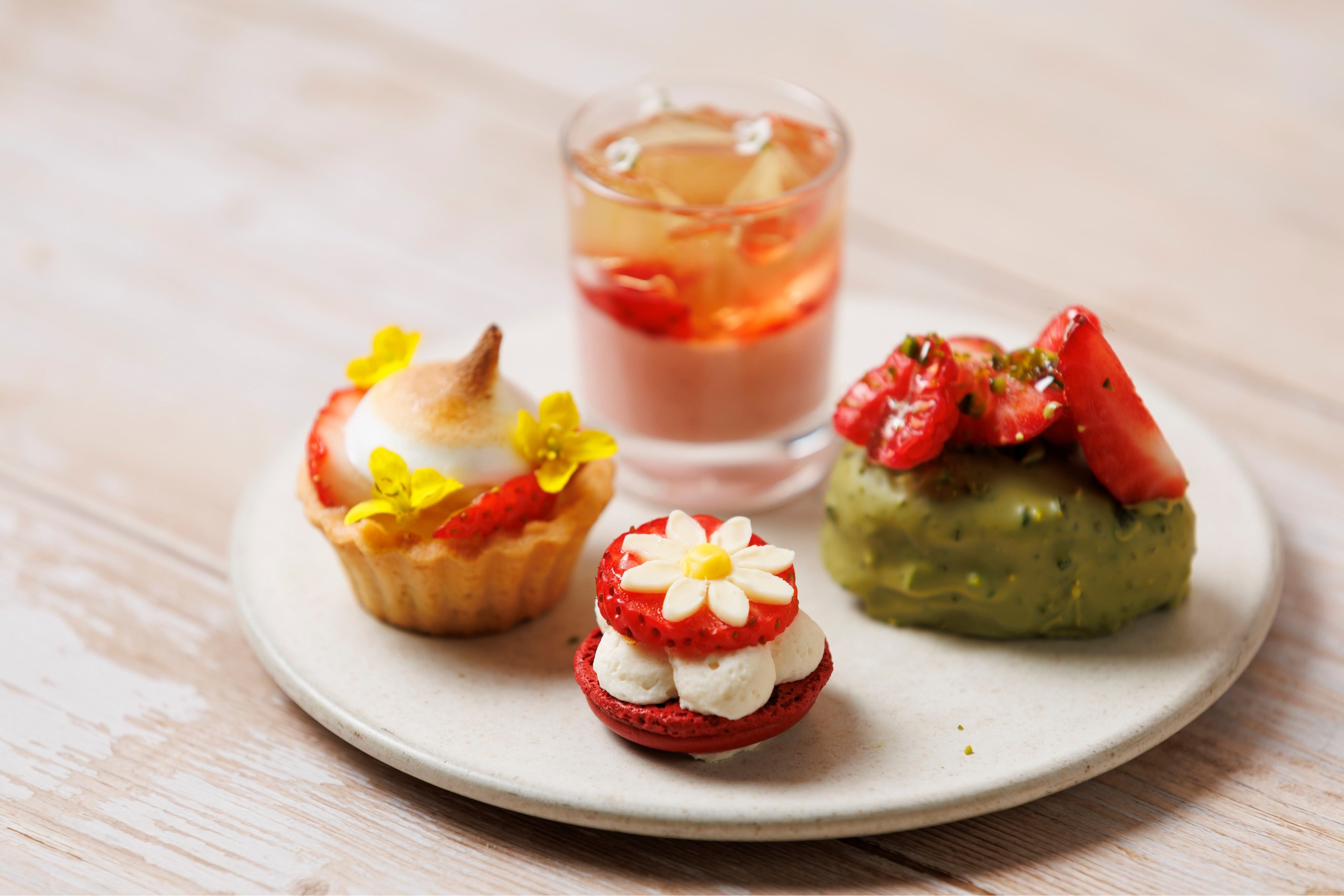 「有機苺のアフタヌーンティー」の象徴となるスイーツが揃う上段には、有機苺とカモミールを合わせたジュレを苺プリンに乗せた「有機苺とカモミールのヴェリーヌ」、香ばしいピスタチオとバターの香りが口いっぱいに広がる「有機苺とピスタチオのフィナンシェ」、トップにエディブルフラワーを飾った「有機苺とライムチョコレートタルト」は、ライムクリームとチョコレートガナッシュの2層にメレンゲを絞り、甘さと爽やかさの絶妙なバランスを味わっていただけます。
