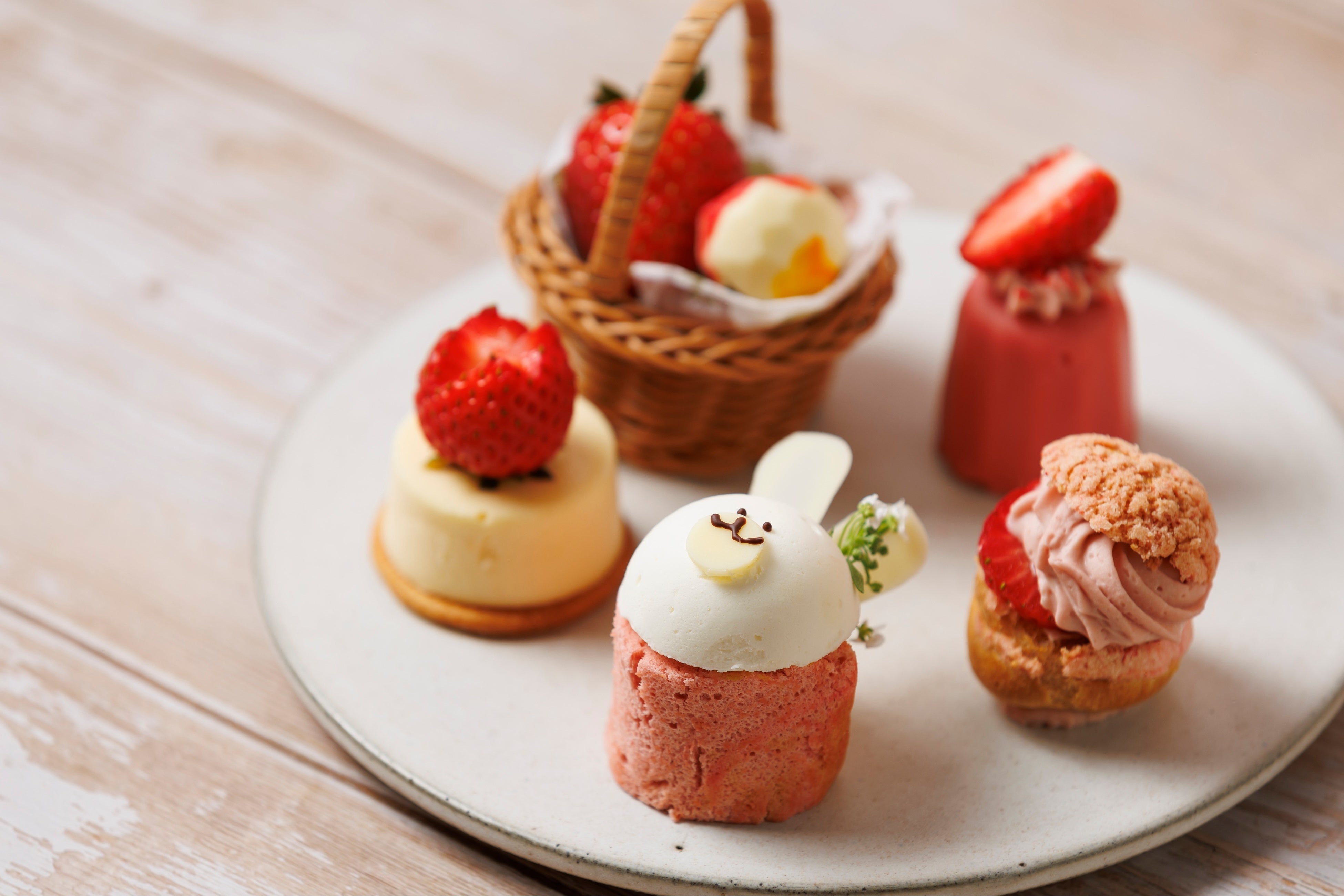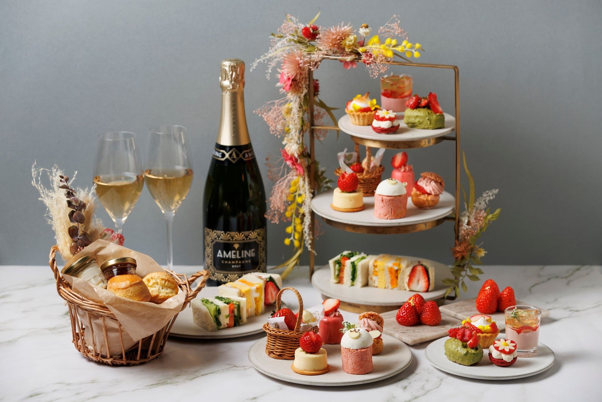 滑らかな口あたりの「有機苺と練乳のロールケーキ」をはじめ、「チーズケーキと有機苺」や「有機苺とライチのムース」、サクッとした食感のシュー生地にヘーゼルナッツプラリネと有機苺クリームをたっぷりと絞った「有機苺とヘーゼルナッツプラリネのシュー」を中段にご用意。ひと口サイズのサンドイッチが並ぶ下段には「有機苺と生ハムのサンドイッチ」、「平飼い卵と人参のサンドイッチ」、「無農薬野菜のサンドイッチ」の3種類がラインナップし、自家製スコーン」は別皿でご提供いたします。「有機苺の自家製コンフィチュール」や「クロテッドクリーム」と一緒にお召し上がりください。