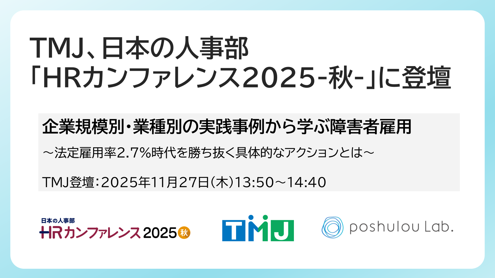 日本の人事部 「HRカンファレンス」は、日本最大のHRイベントとして、企業の人事部門が抱える経営課題や人材マネジメントに関する最新情報を提供する場です。今回、TMJは「障害者雇用」をテーマに、法定雇用率2.7%への上昇を見据えた実践的なアプローチについて講演します。
